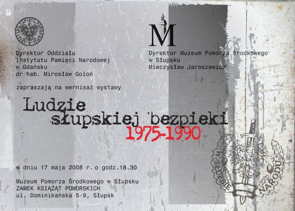 W dniu 17 maja 2008 r. w Słupsku miało miejsce otwarcie wystawy „Ludzie słupskiej bezpieki 1975–1990”. Licznie zgromadzonych gości (około 200 osób) powitał gospodarz Zamku Książąt Pomorskich Mieczysław Jaroszewicz, dyrektor Muzeum Pomorza Środkowego w Słupsku. W uroczystości otwarcia uczestniczyli m.in. posłowie na Sejm RP Jolanta Szczypińska i Zbigniew Konwiński, członek Trybunału Stanu Anna Bogucka-Skowrońska, przewodniczący Zarządu Regionu NSZZ „Solidarność” w Słupsku Stanisław Szukała.