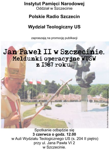Instytut Pamięci Narodowej Oddział w Szczecinie, Polskie Radio Szczecin oraz Wydział Teologiczny Uniwersytetu Szczecińskiego przygotowały promocję wyboru źródeł „Jan Paweł II w Szczecinie”. Spotkanie odbyło się 3 czerwca 2008 r. w auli Wydziału Teologicznego US przy ul. Jana Pawła VI 2 w Szczecinie.
