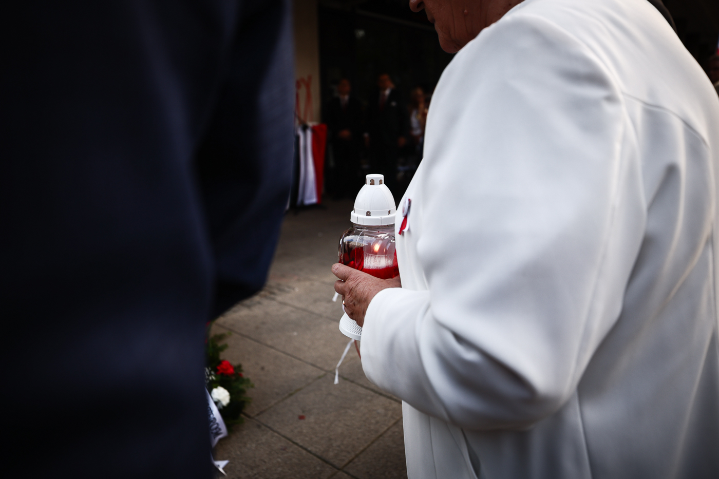 Złożenie kwiatów pod tablicą upamiętniającą podpisanie przez płk. Antoniego Chruściela „Montera” rozkazu rozpoczęcia Powstania Warszawskiego – Warszawa, 1 sierpnia 2025. Fot. Mateusz Niegowski (IPN) -