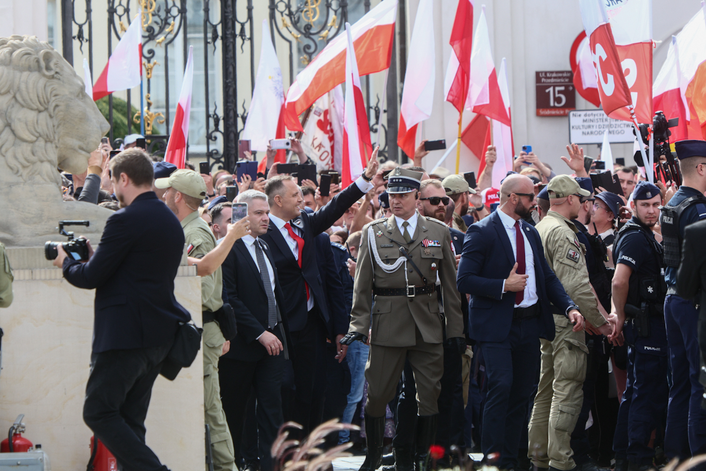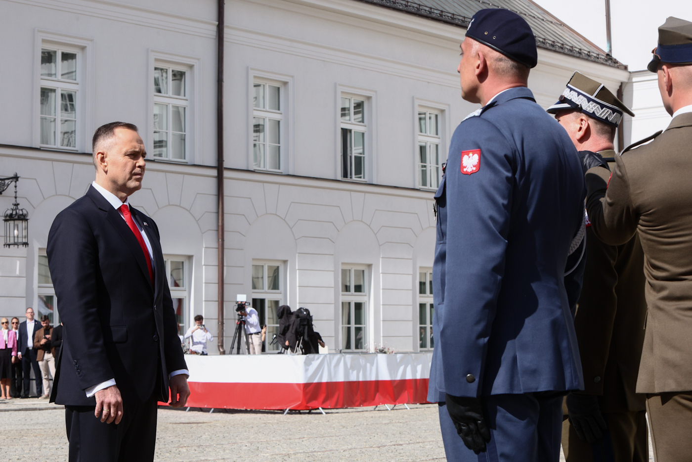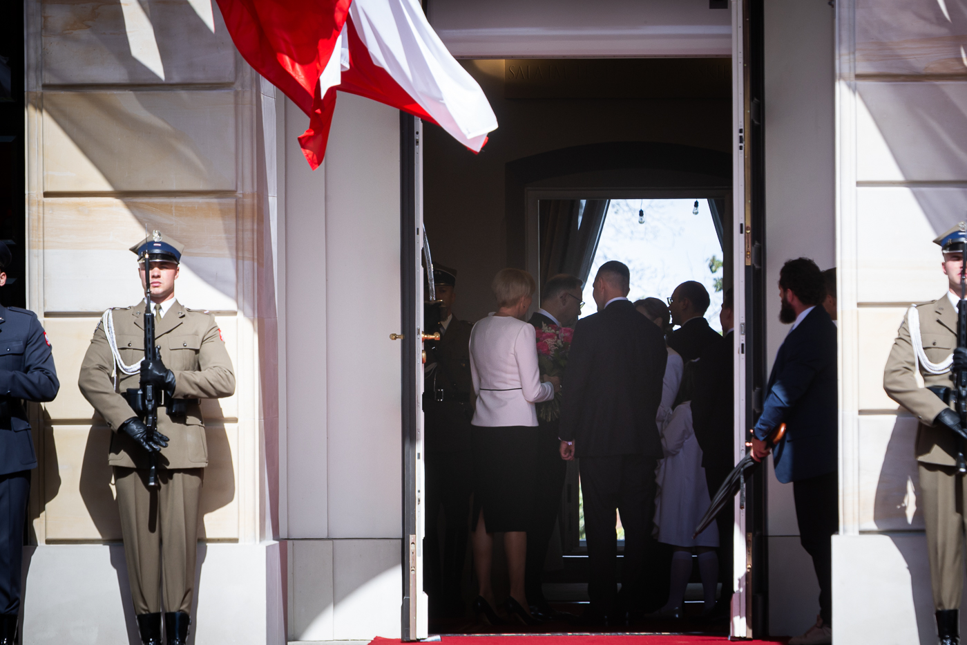 Kolejnym punktem było oficjalne wejście do Pałacu Prezydenckiego, gdzie nowo wybranego prezydenta powitała ustępująca para prezydencka – Andrzej Duda oraz Agata Kornhauser-Duda.