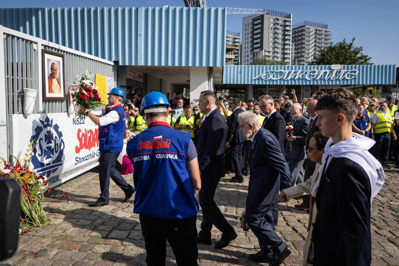 Zauważył również, że Polska dziękuje dziś milionom, którzy w pamiętnym sierpniu stanęli po właściwej stronie, ale nie da się opowiedzieć wielkiej historii „Solidarności” bez wielkich nazwisk. Prezydent RP przekazał wyrazy wdzięczności obecnym na uroczystości Joannie i Andrzejowi Gwiazdom oraz Krzysztofowi Wyszkowskiemu. Wspomniał też śp. Annę Walentynowicz – „Matkę Solidarności” – kobietę będącą uosobieniem odwagi, zdecydowania i poświęcenia – tych wszystkich cech, które przed czterdziestoma pięcioma laty charakteryzowały pragnących wolności Polaków.