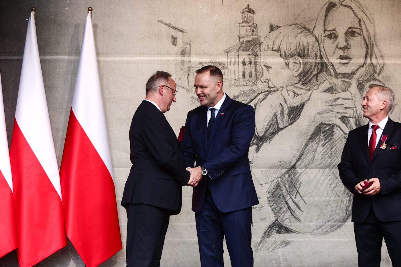 Obchody 86. rocznicy wybuchu II wojny światowej w Wieluniu. Na zdj. od lewej: Prezydent RP Karol Nawrocki zastępca prezesa IPN i dr hab. Karol Polejowski – 1 września 2025. Fot. Sławek Kasper (IPN) -