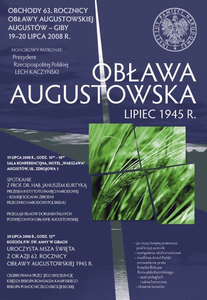 Tegoroczne obchody rocznicowe obławy augustowskiej odbyły się pod patronatem honorowym Prezydenta RP Lecha Kaczyńskiego. Uroczystości rozpoczęło w sobotę 19 lipca w wypełnionej po brzegi sali hotelu „Warszawa” ponad dwugodzinne spotkanie zastępcy prezesa IPN dr. Franciszka Gryciuka z rodzinami ofiar obławy, kombatantami i mieszkańcami Ziemi Augustowskiej. Prokuratorzy Marek Sosnowski z Głównej Komisji Ścigania Zbrodni przeciwko Narodowi Polskiemu oraz Zbigniew Kulikowski z OKŚZpNP w Białymstoku przedstawili aktualny stan śledztwa w sprawie obławy. Dotąd przesłuchano ponad pięciuset świadków i przeprowadzono kwerendy we wszystkich możliwych zasobach archiwalnych. Działania te, podobnie jak kilkakrotne prośby o pomoc prawną ze strony Rosji i Białorusi, nie przyniosły dotąd odpowiedzi na kluczowe pytania: jak, gdzie i kiedy zginęły ofiary obławy. W najbliższym czasie prowadzone będą kwerendy w archiwach litewskich, jednak bez otwarcia archiwów rosyjskich pełne wyjaśnienie tej sprawy nie będzie możliwe. Zebrani zadawali też mnóstwo innych pytań i przekazali nowe informacje na temat zbrodni komunistycznych, popełnionych po wojnie na Suwalszczyźnie. Po zakończeniu dyskusji odbył się pokaz filmów dokumentalnych na temat obławy, powstałych przy udziale IPN.