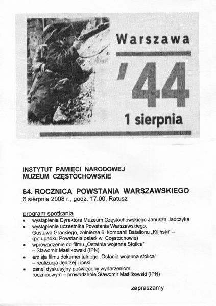 6 sierpnia 2008 r. o godzinie 17.00 w Muzeum Częstochowskim przy Alei Najświętszej Maryi Panny 45a w Częstochowie odbędzie się spotkanie z okazji 64. rocznicy wybuchu Powstania Warszawskiego. Spotkaniu towarzyszyć będzie wystąpienie Gustawa Grackiego – żołnierza 6. kompanii Batalionu „Kiliński”, uczestnika Powstania Warszawskiego, prelekcja Sławomira Maślikowskiego – pracownika OBEP IPN Katowice, oraz projekcja filmu „Ostatnia wojenna stolica”. Spotkanie uwieńczy panel dyskusyjny.