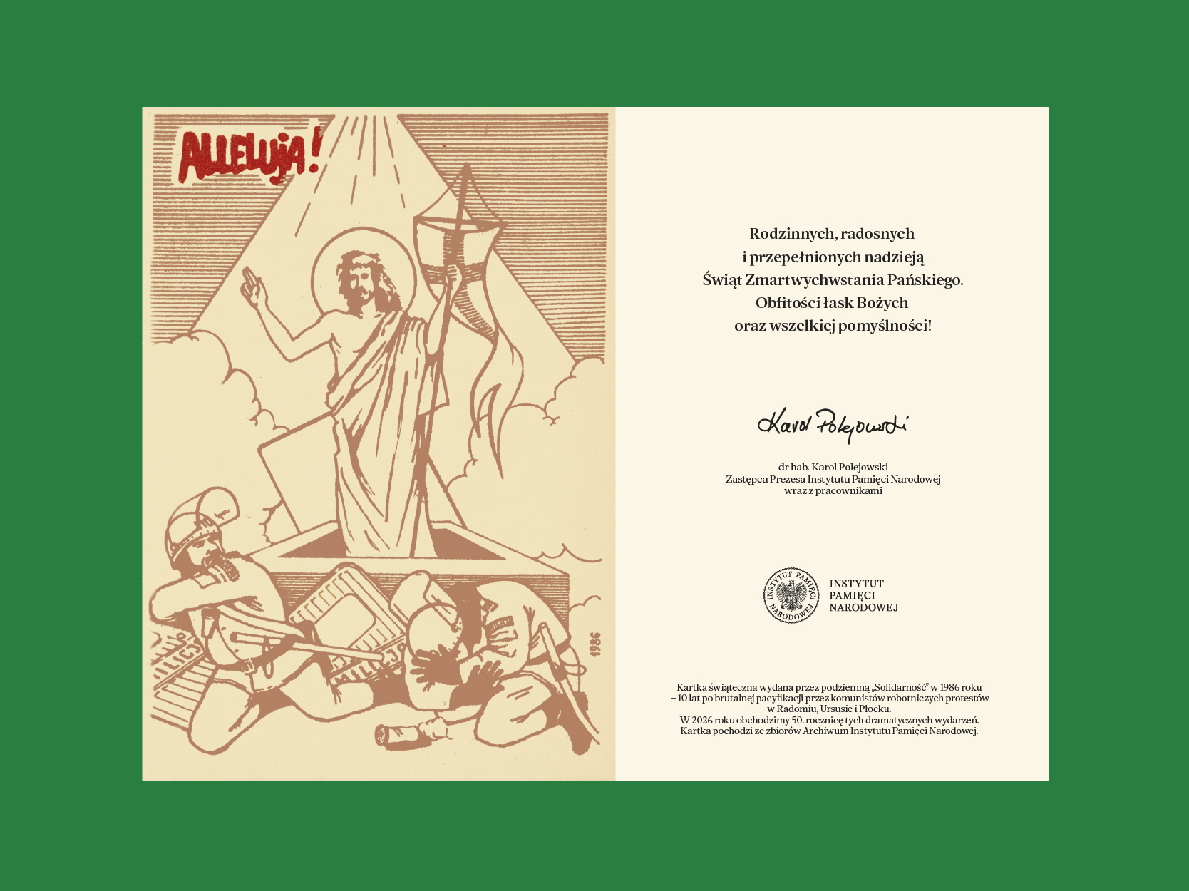 Kartka świąteczna wydana przez podziemną „Solidarność” w 1986 roku – 10 lat po brutalnej pacyfikacji przez komunistów robotniczych protestów w Radomiu, Ursusie i Płocku.