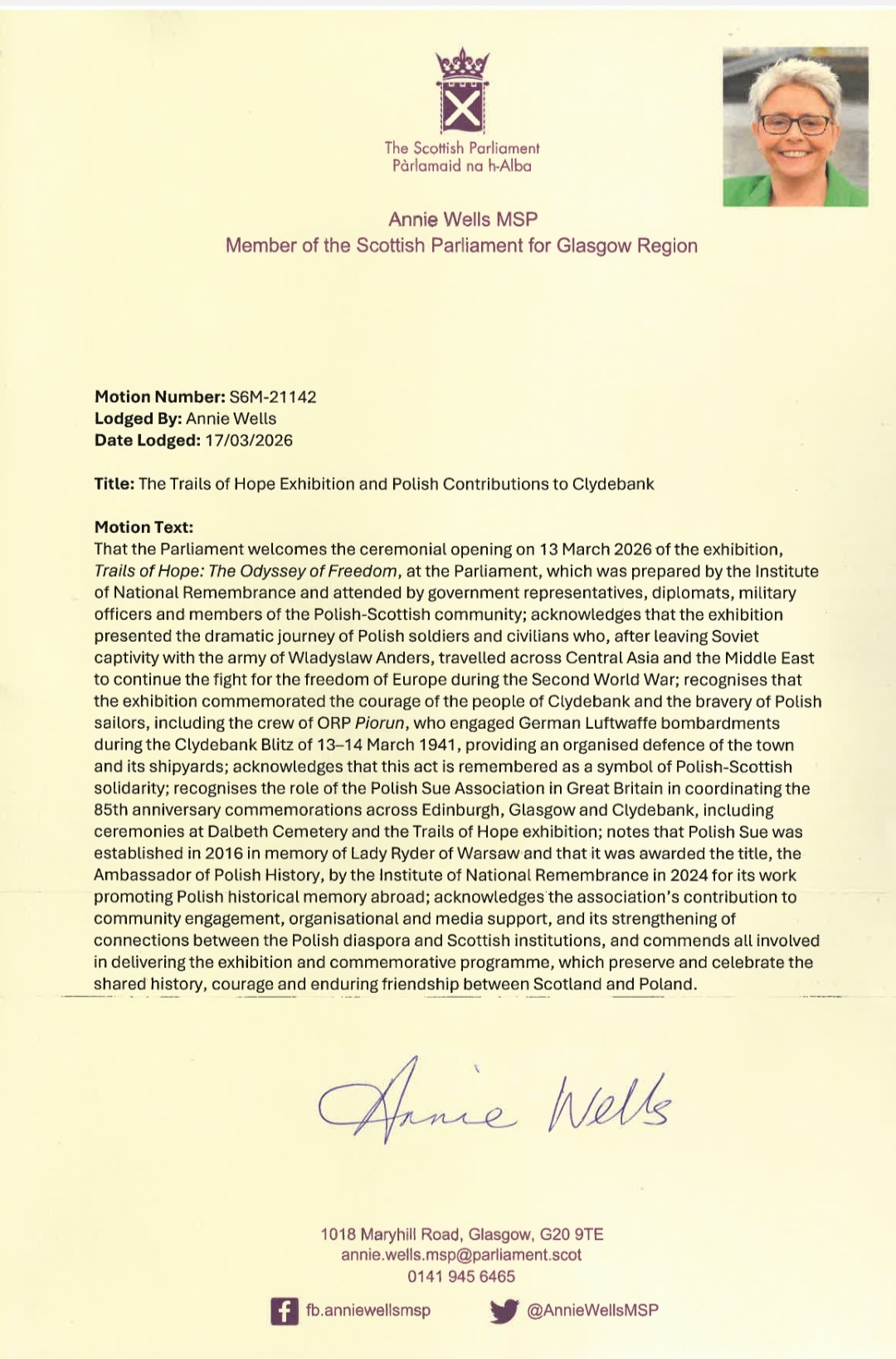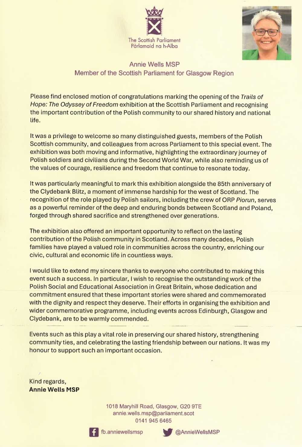Wyjątkowe wyróżnienie jest rezultatem uroczystej prezentacji wystawy „Szlaki Nadziei. Odyseja Wolności”, która miała miejsce 13 marca 2026 roku w Parlamencie Szkockim. Wystawa opowiada dramatyczną historię polskich żołnierzy i cywilów, którzy po opuszczeniu sowieckiej niewoli wraz z generałem Władysławem Andersem przemierzyli Azję Środkową i Bliski Wschód, aby kontynuować walkę o wolność Europy podczas II wojny światowej.