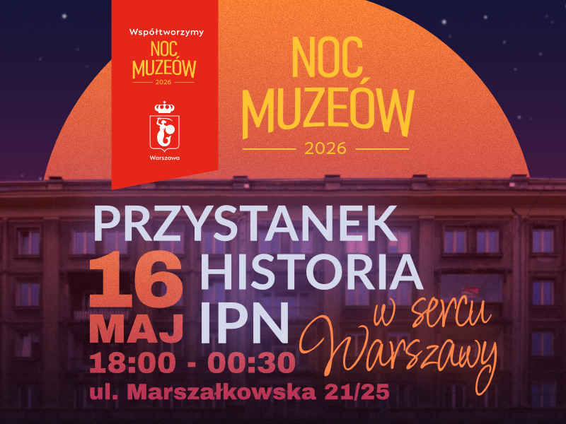 16 maja 2026 r. zapraszamy od godziny 18.00 do 00.30 do naszej siedziby Centrum Edukacyjnego IPN im. Janusza Kurtyki przy Marszałkowskiej 21/25 (przy Trasie Łazienkowskiej i Metrze Politechnika).