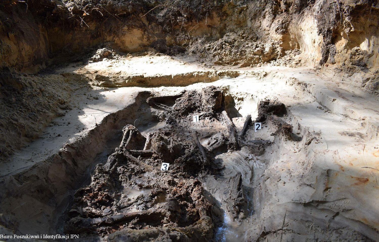 Prace rozpoczęto od demontażu upamiętnienia i zabezpieczenia jego elementów. Po odsłonięciu wyznaczonej powierzchni gruntu, na głębokości ok. 1 m odkryto szczątki należące do 3 osób. Na podstawie wstępnej analizy antropologicznej stwierdzono, że najprawdopodobniej byli to mężczyźni między 26 a 40 rokiem życia. Jeden z nich miał wyraźnie widoczne rany postrzałowe nóg. Warto zaznaczyć, że ze względu na trudne warunki środowiskowe, m.in. obecność licznych cieków wodnych, szczątki były w złym stanie zachowania, co jedocześnie utrudniało ich podjęcie oraz przebadanie. Zachowały się tylko strzępy ubrań, nie było żadnych artefaktów.