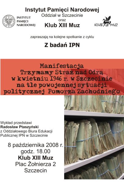 Instytut Pamięci Narodowej oraz Klub 13 Muz przygotowały wykład otwarty z cyklu „Z badań IPN”. Prelekcję „Manifestacja »Trzymamy straż nad Odrą« z kwietnia 1946 r. w Szczecinie na tle powojennej sytuacji społecznej i politycznej Pomorza Zachodniego” wygłosił Radosław Ptaszyński. Spotkanie odbyło się 8 października 2008 r. w Sali Kominkowej Klubu 13 Muz.
