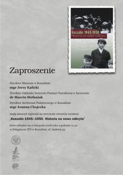 11 listopada 2008 roku w sali wystawowej, mieszczącej się w Delegaturze IPN w Koszalinie, nastąpiło uroczyste otwarcie wystawy „Koszalin 1945–1950. Historia na nowo odkryta”. Dokonali tego prezydent Koszalina Mirosław Mikietyński, dyrektor IPN w Szczecinie dr Marcin Stefaniak oraz Danuta Szewczyk z Muzeum w Koszalinie. W wernisażu uczestniczyli mieszkańcy Koszalina oraz zaproszeni goście.