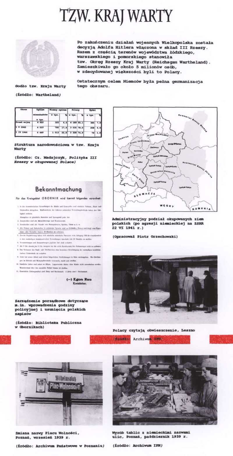 Wystawę tworzą 32 plansze wypełnione dokumentami, fotografiami i komentarzem historycznym. Część zdjęć pochodzi z archiwów IPN, pozostałe – w większości publikowane po raz pierwszy – pracownicy poznańskiego OBEP odnaleźli w wielkopolskich archiwach i muzeach regionalnych. Oryginalna scenografia, przygotowana przez poznańskich plastyków – Agnieszkę Gierach, Karola Furyka i Piotra Rogalińskiego – nawiązuje do niemieckich planów całkowitej germanizacji tzw. Kraju Warty, który miał być przemieniony we wzorcowy okręg Rzeszy zarządzany przez Arthura Greisera.