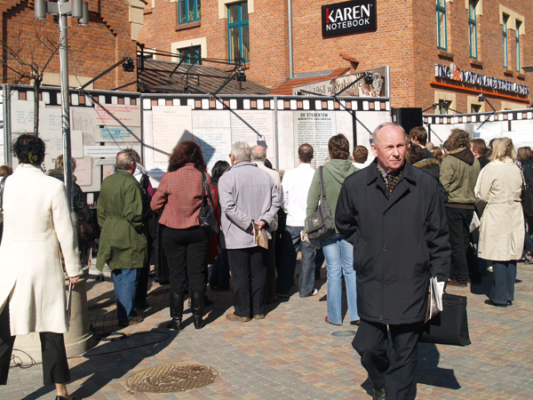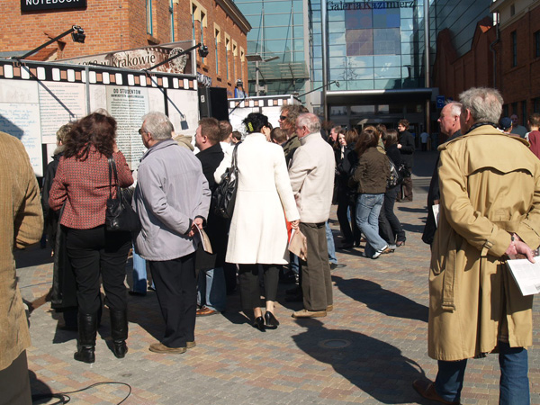 Uroczysty wernisaż wystawy odbył się 11 marca 2008 r. na Placu Historycznym przy Galerii Kazimierz. Poniżej znajdują się zdjęcia z uroczystości otwarcia oraz debaty „Marzec 1968 – pamięć i przemilczenia”, zorganizowanej tego dnia w Klubie Pod Jaszczurami w Krakowie. Udział w debacie wzięli: prof. dr hab. Adam Bielański, prof. dr hab. Tomasz Gąsowski, prof. dr hab. Ryszard Terlecki oraz dr Julian Kwiek. Wypowiadali się oni na temat postawy uniwersyteckich władz w 1968 r. Niektórzy, jak prof. Ryszard Terlecki czy prof. Tomasz Gąsowski, jako studenci byli świadkami zajść w Krakowie. Doskonale pamiętali wtargnięcie zomowców z pałkami i granatami gazowymi do Collegium Novum. Z kolei prof. Adam Bielański, był jedyną z osób, która spośród władz UJ zachowała się godnie. Po zajściach został on odwołany ze stanowiska prorektora. Opowiadał o bezskutecznie podejmowanych próbach interwencji, w momencie ataku milicjantów na studentki w budynku uczelni.