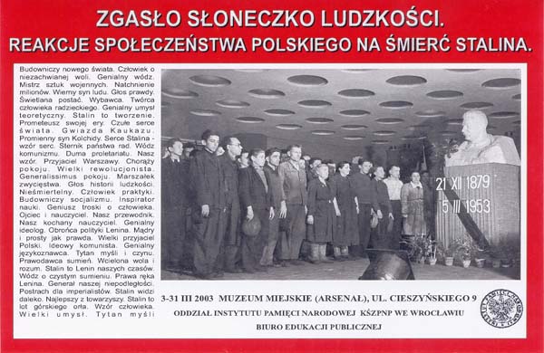 Ekspozycja wzbudziła bardzo duże zainteresowanie, o czym świadczy obecność na wernisażu dużej grupy zwiedzających jak również ogromne zainteresowanie ze strony prasy, radia i telewizji. Wystawę otworzył Prezes Instytutu Pamięci Narodowej prof. dr hab. Leon Kieres w obecności przedstawicieli władz regionu i miasta oraz dużej grupy osób reprezentujących środowiska kombatanckie i młodzież z dolnośląskich szkół i uczelni. Pięćdziesiąt lat, które 5 marca br. upłynęło od śmierci Józefa Stalina jest punktem wyjścia do poznania epoki, której swoim imieniem dał on nazwę. Dlatego obok eksponatów związanych ze śmiercią i pogrzebem, wystawa jest wzbogacona o materiały obrazujące sylwetkę Stalina, kult jednostki, akcje propagandowe, socrealizm, Polskę i świat w dobie stalinowskiej, sylwetki przywódców innych krajów komunistycznych, zbrodnie komunistyczne oraz miejsce Stalina w kolejnych epokach historycznych.
