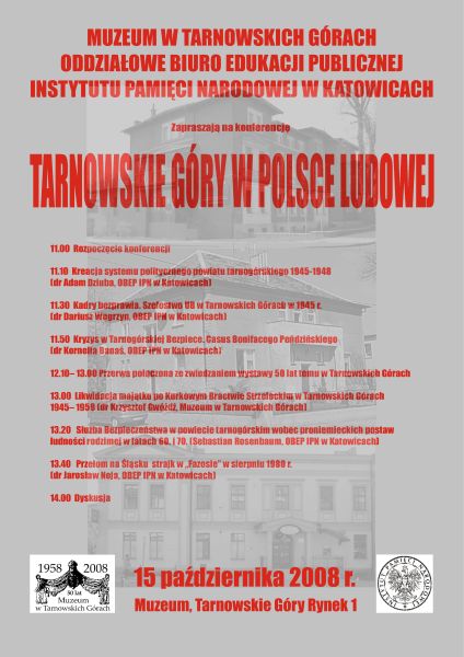 Konferencja „Tarnowskie Góry w Polsce Ludowej” odbyła się w gościnnych murach Muzeum Miejskiego w Tarnowskich Górach. Pracownicy Oddziałowego Biura Edukacji Publicznej IPN w Katowicach i Muzeum Miejskiego w Tarnowskich Górach przedstawili ogółem sześć referatów dotyczących różnych aspektów funkcjonowania komunistycznych instytucji miasta i powiatu tarnogórskiego w rzeczywistości lat 1945-1981. Wystąpienia podzielono na dwa bloki tematyczne. W przerwie pomiędzy nimi można było obejrzeć wystawę, na której zgromadzono sprzęty i urządzenia domowe używane w latach `60. i `70. XX w. przez mieszkańców PRL Z dużą pieczołowitością odtworzono wyposażenie kuchni i salonu (głównego pokoju).