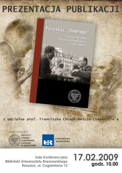 17 lutego 2009 r. w Rzeszowie – w sali konferencyjnej Biblioteki Uniwersytetu Rzeszowskiego, ul. Cegielniana 12, miała miejsce prezentacja książki „Pozyskać »Dobrego«. Wywiad PRL wobec Franciszka Chrapkiewicza i jego rodziny”, pod red. Anny Fary, Piotra Szopy i Roberta Witalca. Prezentacja zorganizowana została wspólnie z Uniwersytetem Rzeszowskim. Na prezentacji książki w Strzyżowie obecny był profesor Franciszek Chrapkiewicz – główny bohater opisywanych w publikacji wydarzeń.