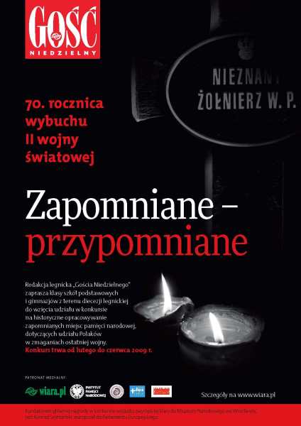 „Gość Legnicki” proponuje uczniom wszystkich szkół średnich i gimnazjalnych na terenie diecezji legnickiej wzięcie udziału w konkursie historycznym „Zapomniane – przypomniane”, zorganizowanym z okazji 70. rocznicy wybuchu II wojny światowej. Do konkursu mogą zgłaszać się całe klasy, które pod opieką nauczycieli historii będą zbierać i dokumentować fotografie zapomnianych miejsc.