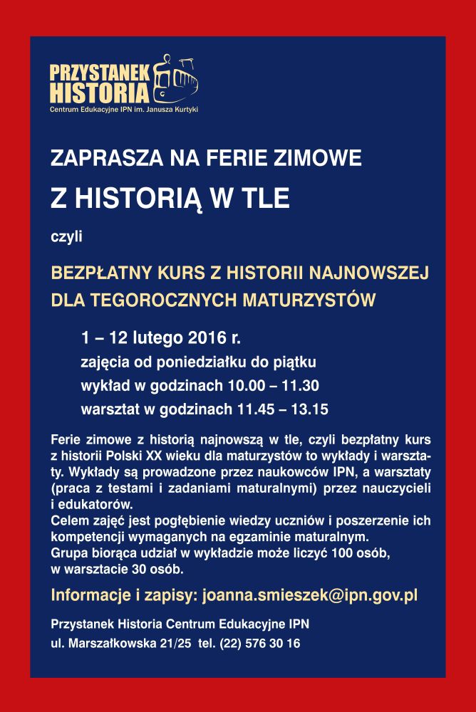 Centrum Edukacyjne IPN Przystanek Historia zaprasza na kolejną edycję zajęć „Ferie zimowe z historią najnowszą w tle”, czyli bezpłatny kurs z historii Polski XX wieku dla maturzystów.