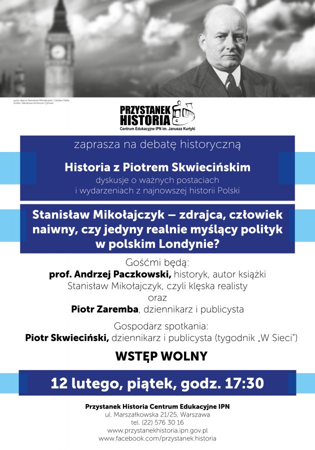 Tematem spotkania będzie działalność polityczna Stanisława Mikołajczyka. Czy niekomuniści mogli dogadać się ze Stalinem? Stanisław Mikołajczyk – zdrajca, człowiek naiwny czy jedyny realnie myślący polityk w polskim Londynie? Był skazany na klęskę czy może miał szanse? Będą o tym dyskutować goście Piotra Skwiecińskiego: prof. Andrzej Paczkowski – historyk, autor książki Stanisław Mikołajczyk, czyli klęska realisty, oraz Piotr Zaremba – dziennikarz i publicysta.
