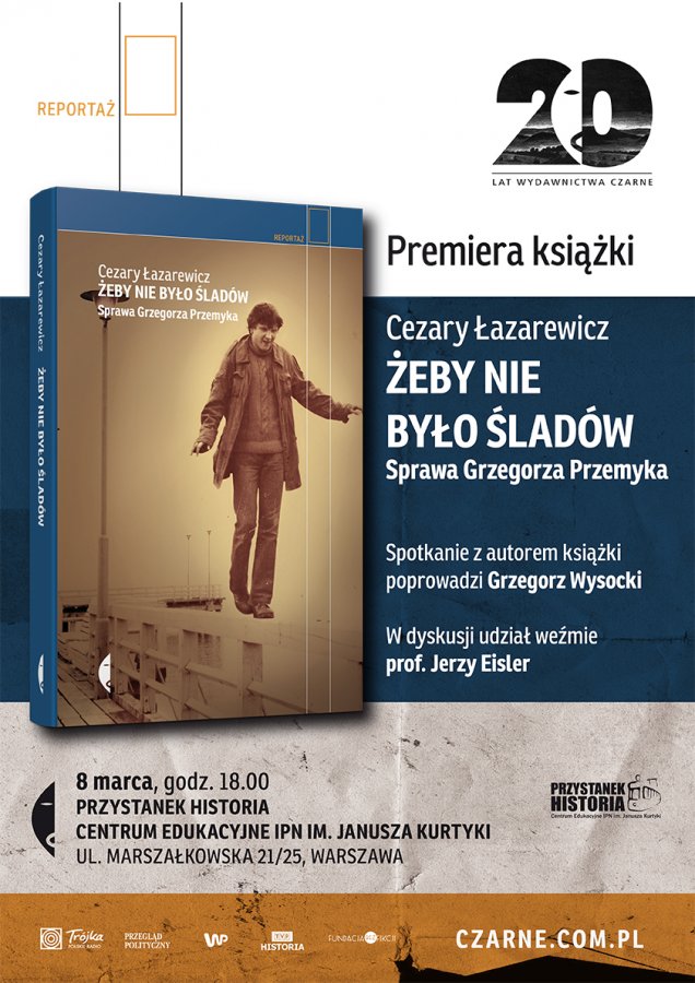 Zapraszamy do Centrum Edukacyjnego IPN Przystanek Historia na prezentację książki Cezarego Łazarewicza Żeby nie było śladów. Sprawa Grzegorza Przemyka opublikowanej przez wydawnictwo Czarne. Rozmowę z udziałem autora oraz prof. Jerzego Eislera, dyrektora warszawskiego oddziału IPN, poprowadzi Grzegorz Wysocki, szef Działu Opinie w Wirtualnej Polsce.