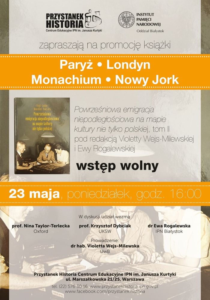 Przystanek Historia – Centrum Edukacyjne IPN im. Janusza Kurtyki i Oddział IPN w Białymstoku zapraszają na promocję książki na promocję książki Paryż – Londyn – Monachium – Nowy Jork. Powrześniowa emigracja niepodległościowa na mapie kultury nie tylko polskiej, tom II, pod redakcją Violetty Wejs-Milewskiej i Ewy Rogalewskiej.