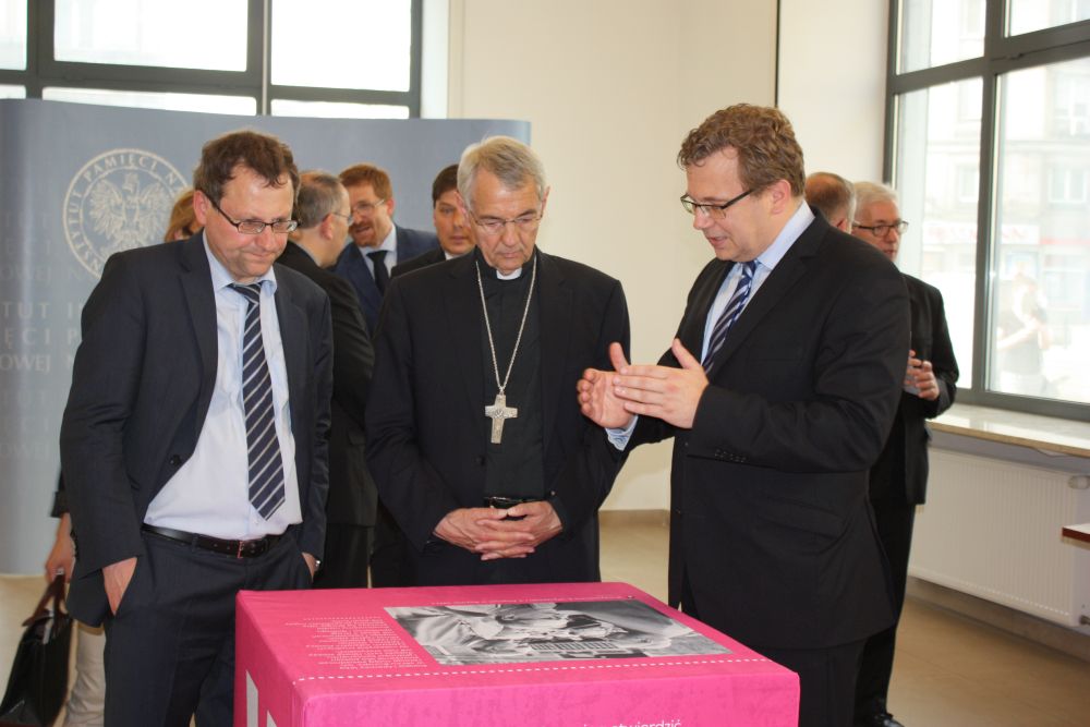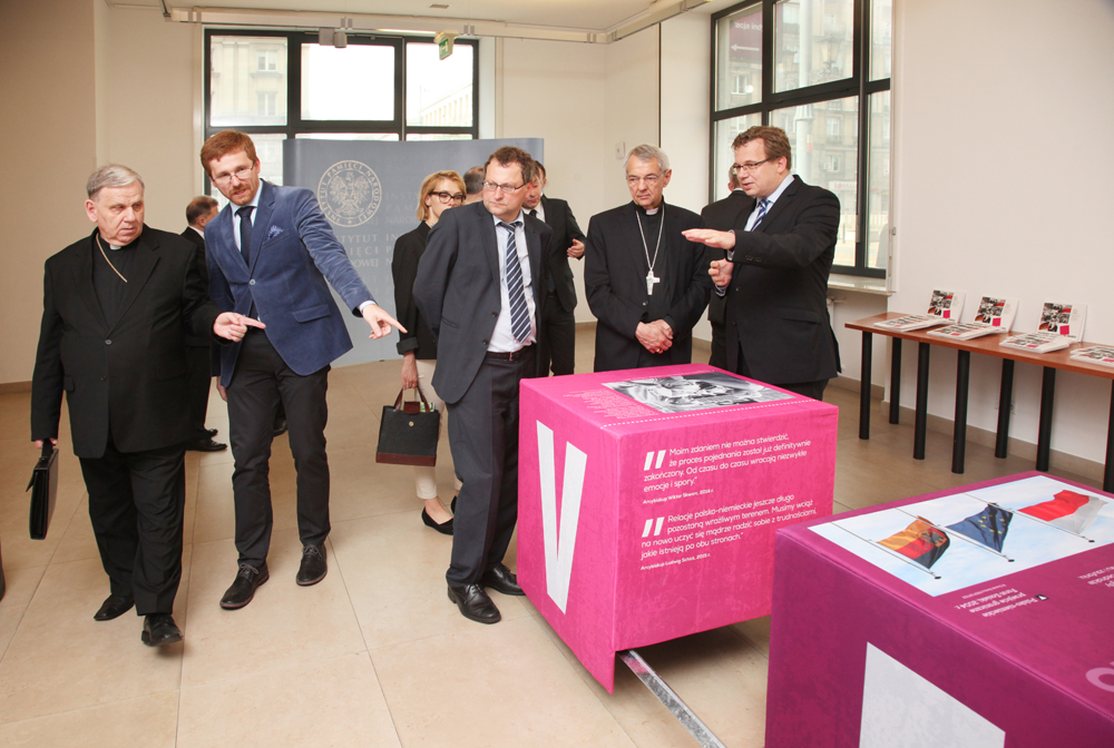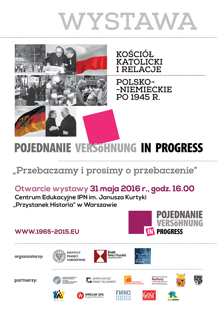 31maja 2016 r., o godz. 16.00, w Centrum Edukacyjnym IPN im. Janusza Kurtyki„Przystanek Historia” w Warszawie, przy ul. Marszałkowskiej 21/25, odbyło sięuroczyste otwarcie wystawy mobilnej „Pojednanie/Versöhnung in progress… Kościółkatolicki i relacje polsko-niemieckie po 1945 r.”. Oprócz prezesa IPN dr.Łukasza Kamińskiego w spotkaniu wzięli udział także: Jan Parys – szef GabinetuPolitycznego Ministra Spraw Zagranicznych RP, ManfredHuterer – minister pełnomocny, zastępca ambasadora Republiki Federalnej Niemiec,członkowie grupy kontaktowej episkopatów Polski i Niemiec: kardynał KazimierzNycz – metropolita warszawski, arcybiskupWiktor Skworc – metropolita katowicki, biskup JanKopiec z diecezji gliwickiej, arcybiskup BamberguLudwig Schick i biskup Wolfgang Ipolt z diecezji Görlitz oraz ks. prałatJarosław Mrówczyński – zastępca sekretarzageneralnego Konferencji Episkopatu Polski.