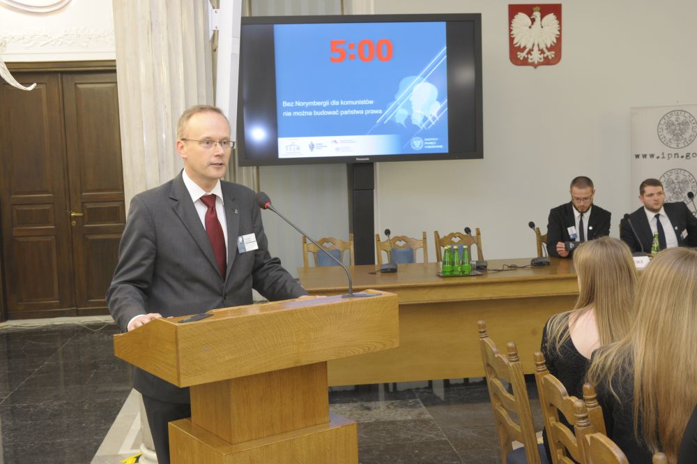 W debaciefinałowej wystąpili uczniowie III LO im. Unii Lubelskiej w Lublinie oraz VI LOim. Wacława Sierpińskiego w Gdyni, którzy dyskutowali nad tezą „Bez Norymbergidla komunistów nie można budować państwa prawa”. Licealiści z Lublinaprzekonywali, że rozliczenie z komunizmem jest konieczne dla zbudowania państwaprawa, m.in. dlatego, że takie rozliczenie jest warunkiem fundamentalnego dlaspołeczności ludzkiej poczucia sprawiedliwości. Przeciwnego zdania byliuczniowie z Gdyni, którzy z kolei udowadniali, że demokratyczne państwo prawamoże sprawnie funkcjonować bez „gigantycznych i kosztownych procesów”, takichjakie były po 1945 r. w Norymberdze.
