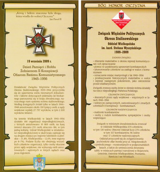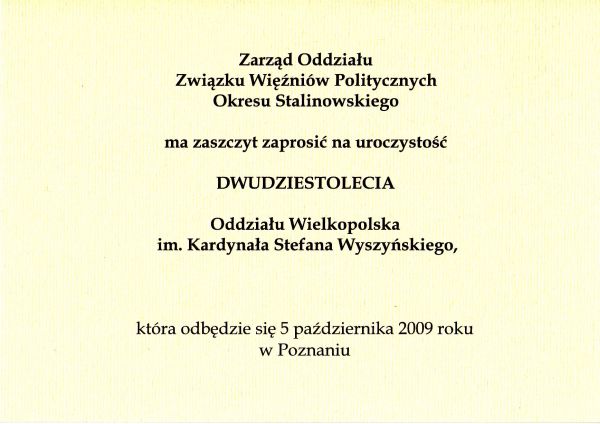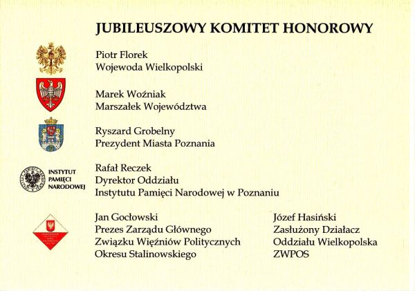 W tym roku mija 20. rocznica powstania Zarządu Oddziału Związku Więźniów Politycznych Okresu Stalinowskiego w Poznaniu. 5 października bm. odbyły się w Poznaniu uroczystości upamiętniające powstanie Związku. Zainaugurowała je msza, po której w krużgankach kościoła oo. Dominikanów odbył się apel oraz złożono kwiaty pod tablicą pamiątkową. Następnie w holu Wielkopolskiego Urzędu Wojewódzkiego otwarto przygotowaną przez Instytut Pamięci Narodowej wystawę „Zaplute karły reakcji. Polskie podziemie niepodległościowe 1944–1956”. Podczas uroczystości wręczono również nagrody zwycięzcom gry miejskiej organizowanej przez Oddziałowe Biuro Edukacji Publicznej IPN w Poznaniu „Śladami drugiej konspiracji w Poznaniu”. Następnie zaproszeni goście, m.in. kombatanci, przedstawiciele organizacji samorządowych, Instytutu Pamięci Narodowej Oddział w Poznaniu, uczniowie poznańskich szkół oraz przybyli mieszkańcy Poznania uczestniczyli w uroczystości jubileuszowej w sali sesyjnej WUW.