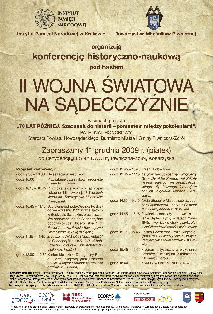 Oddział Instytutu Pamięci Narodowej w Krakowie oraz Towarzystwo Miłośników Piwnicznej zorganizowały konferencję historyczno-naukową „II Wojna Światowa na Sądecczyźnie” w ramach projektu „70 lat później. Szacunek do historii – pomostem między pokoleniami”. Konferencja odbyła się 11 grudnia w rezydencji „Leśny Dwór”, Piwniczna-Zdrój, Kosarzyska.