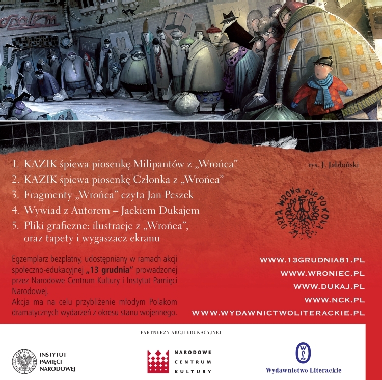 Wydawnictwo Literackie w związku z rocznicą stanu wojennego wydało książkę pt. „Wroniec” wybitnego polskiego pisarza Jacka Dukaja, cenionego szczególnie przez młodych odbiorców. Zarówno koncepcja i język książki, jak i ilustracje posiadają walory, które czynią z nich punkt wyjścia do bardzo atrakcyjnej i szeroko zakrojonej, skierowanej do młodzieży akcji edukacyjnej związanej z rocznicą grudnia `81. Materiał zawarty w książce daje szerokie możliwości rozbudowy i stworzenia wielu ciekawych materiałów edukacyjnych. I właśnie te możliwości w ramach proponowanej akcji staramy się wykorzystać.