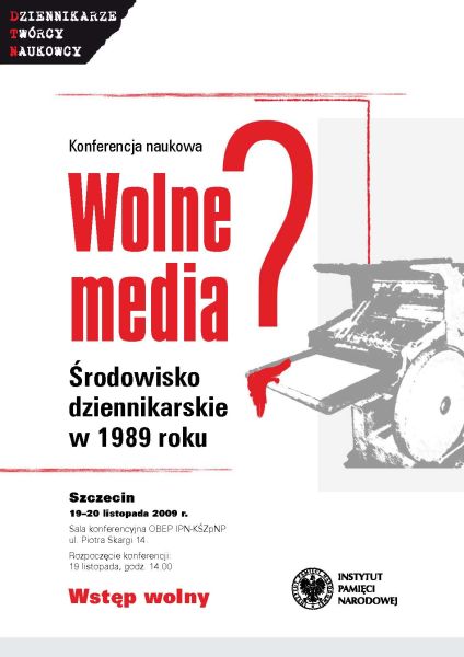 W ramach projektu badawczego „Aparat bezpieczeństwa wobec środowisk twórczych, dziennikarskich i naukowych”  Biura Edukacji Publicznej IPN-KŚZpNP w dniach 19–20 listopada 2009 r. w siedzibie Oddziałowego Biura Edukacji Publicznej IPN-KŚZpNP w Szczecinie, przy ul. Piotra Skargi 14, odbędzie się konferencja naukowa pt. „Wolne media? Środowisko dziennikarskie w 1989 roku”. Do udziału zaprosiliśmy grono badaczy od lat zajmujących się badaniem archiwów byłej Służby Bezpieczeństwa oraz spuścizny po Polskiej Zjednoczonej Partii Robotniczej, którzy opowiedzą o wynikach swoich kwerend. Poruszona tematyka od lat budzi zainteresowanie ze względu na charakter zmian przeprowadzanych w tym ważnym, z punktu widzenia dziejów Polski, okresie. Konferencja ma za zadanie przybliżenie tego, co działo się w środowisko dziennikarskim, oraz przedstawienie postaw konkretnych postaci.