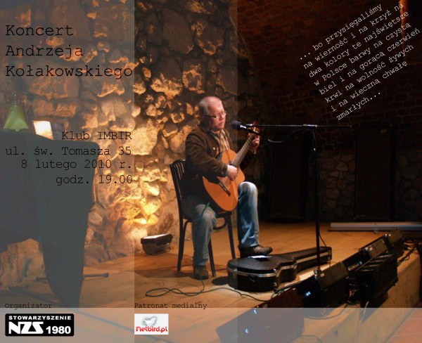 Stowarzyszenie „NZS 1980” oraz portal Netbird.pl zorganizowały recital piosenek „Oskarżeni o wierność – Żołnierzom Wyklętym…” w wykonaniu Andrzeja Kołakowskiego, poety i pieśniarza, działacza opozycyjnego oraz popularyzatora historii. Występ odbył się 8 lutego 2010 r. w Klubie „Imbir”, ul. św. Tomasza 35.