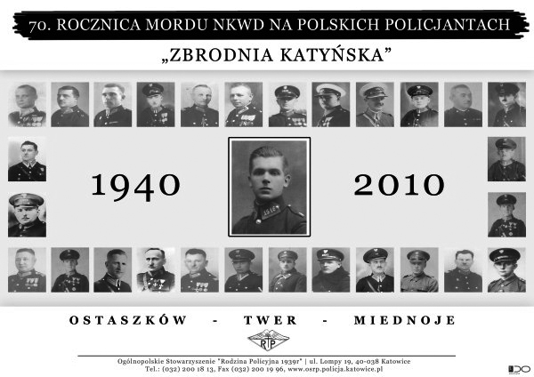 Zarząd Ogólnopolskiego Stowarzyszenia „Rodzina Policyjna 1939 r.” w Katowicach i Komenda Wojewódzka Policji w Katowicach zorganizowały obchody 70. rocznicy mordu NKWD na polskich policjantach „Zbrodnia Katyńska”, które odbyły się 9 kwietnia 2010 r. w auli im. aspiranta Policji woj. śląskiego Jana Kali w gmachu Komendy Wojewódzkiej Policji w Katowicach przy ul. Lompy 19.