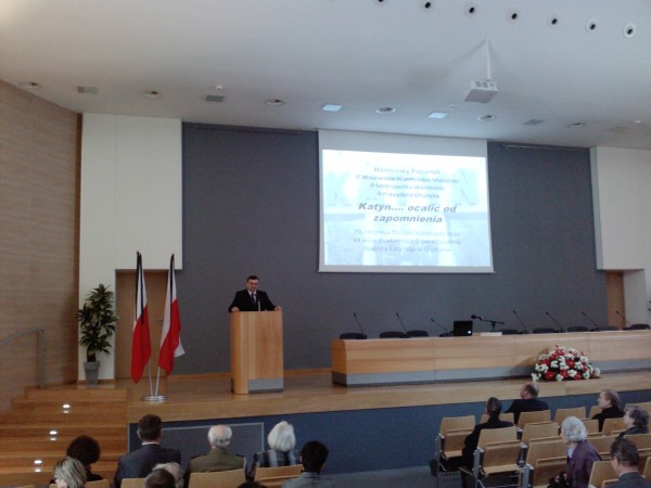 Z kolei 16 kwietnia br. w holu Urzędu Wojewódzkiego w Olsztynie naczelnik Delegatury IPN prof. Jasiński otworzył wystawę „Zbrodnia Katyńska”. Obchody uświetniła zorganizowana wspólnie przez IPN i Urząd Wojewódzki konferencja, połączona z obchodami dwudziestolecia działalności Stowarzyszenia Rodzina Katyńska w Olsztynie. Uczestnicy konferencji minutą ciszy uczcili ofiary katastrofy pod Smoleńskiem. Podczas konferencji Mirosława Aleksandrowicz zaprezentowała wydarzenia z dwudziestolecia olsztyńskiego Stowarzyszenia Rodzina Katyńska, mecenas Józef Lubieniecki opowiedział o działaniach olsztyńskiej „Solidarności” przywracających pamięć o Zbrodni Katyńskiej, Renata Gieszczyńska z Delegatury IPN przedstawiła raport o stanie śledztwa IPN w sprawie mordu katyńskiego, natomiast prof. Tadeusz Wolsza z Polskiej Akademii Nauk wystąpił z referatem pt. „W polskim Londynie i sowieckiej Warszawie o zbrodni katyńskiej (1945–1956)”.