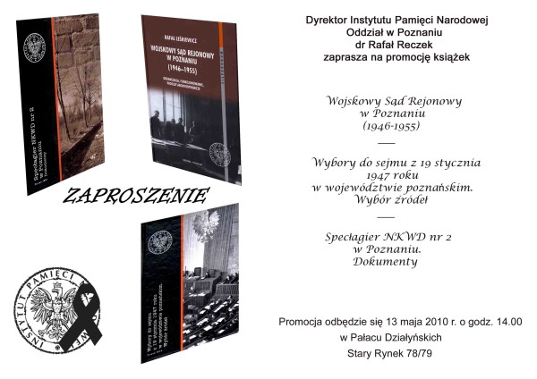 Promocja książek: „Wojskowy Sąd Rejonowy w Poznaniu (1946-1955), Specłagier NKWD nr 2 w Poznaniu. Dokumenty” i „Wybory do sejmu z 19 stycznia 1947 roku w województwie poznańskim. Wybór źródeł” – Poznań, 13 maja 2010