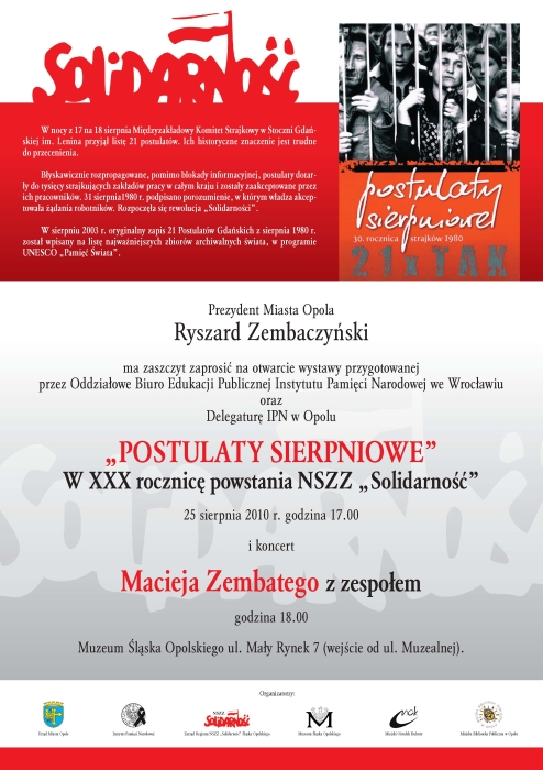 W dniu 25 sierpnia br. w Muzeum Śląska Opolskiego została otwarta wystawa „Postulaty sierpniowe. W XXX rocznicę powstania NSZZ »Solidarność«”. Ekspozycja została przygotowana przez Oddziałowe Biuro Edukacji Publicznej IPN we Wrocławiu i Delegaturę IPN w Opolu.