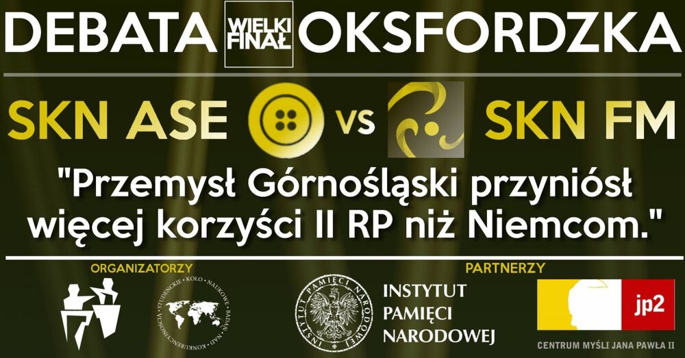 Biuro Edukacji Narodowej IPN po raz kolejny patronuje najstarszemu w Polsce studenckiemu Turniejowi Debat Oksfordzkich organizowanemu przez Koło Naukowe Badań nad Konkurencyjnością Szkoły Głównej Handlowej w Warszawie. 8 maja o godz. 19.00 odbędzie się debata finałowa turnieju nad tezą „Przemysł Górnośląski przyniósł więcej korzyści II RP niż Niemcom”. W debacie zmierzą się reprezentacje SKN Finansów i Makroekonomii SGH oraz SKN Austriackiej Szkoły Ekonomii.