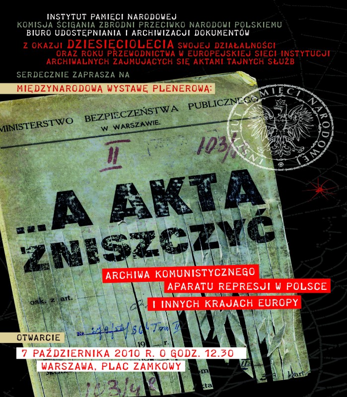 Instytut Pamięci Narodowej – Komisja Ścigania Zbrodni przeciwko Narodowi Polskiemu Biuro Udostępniania i Archiwizacji Dokumentów z okazji dziesięciolecia swojej działalności oraz roku przewodnictwa w Europejskiej Sieci Instytucji Archiwalnych Zajmujących się Aktami Tajnych Służb serdecznie zaprasza na