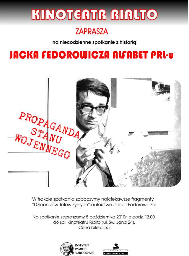 Oddział Instytutu Pamięci Narodowej w Katowicach oraz katowicki Kinoteatr Rialto zorganizowały kolejne niecodzienne spotkanie z historią: „Jacka Fedorowicza »Alfabet PRL-u« – Propaganda stanu wojennego”. Spotkanie odbyło się 5 października 2010 r. w Kinoteatrze Rialto (ul. św. Jana 24). Nasz gość – znany i popularny satyryk, aktor Jacek Fedorowicz w niekonwencjonalny sposób zaprezentował ważne zagadnienia z naszej najnowszej historii. W trakcie spotkania zobaczyliśmy najciekawsze fragmenty „Dzienników telewizyjnych” autorstwa Jacka Fedorowicza.