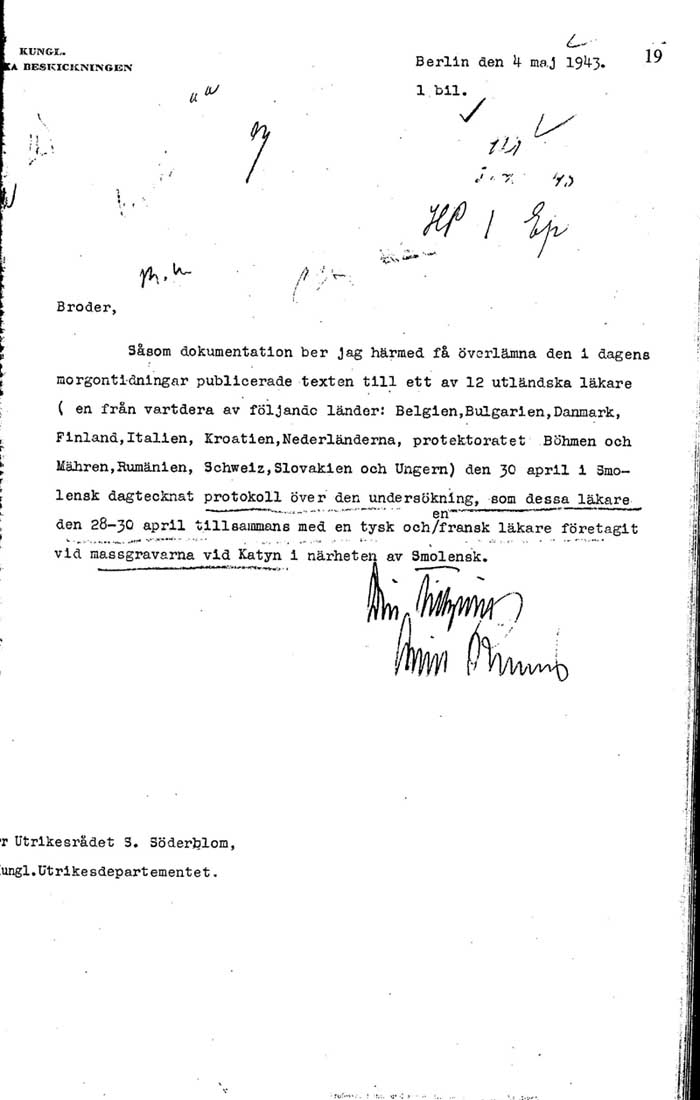 Jednym z niewielu wyjątków, odsłaniających niechęć rządu szwedzkiego by być wciągniętym w tę sprawę jest telegram ówczesnego szefa Wydziału Politycznego Ministerstwa Spraw Zagranicznych Stafana Söderbloma do ambasady w Berlinie. W depeszy informuje Söderblom szefa poselstwa Arvida Richerta, że niejaki doktor Karlmark zapytywany był przez poselstwo niemieckie w Sztokholmie czy zechciałby wejść w skład planowanej przez Niemców komisji badawczej, lecz po zwróceniu się do premiera rządu odpowiedział dr Karlmark, iż nie może się podjąć takiego zadania bez oficjalnego upoważnienia szwedzkiego. Söderblom poinformował także Richerta, że w rozmowie z szefem poselstwa Niemiec w Sztokholmie oświadczył, „iż ze szwedzkiej strony brak jest najmniejszej ochoty by dać się wciągnąć w tę sprawę poza Międzynarodowym Czerwonym Krzyżem”. Międzynarodowy Czerwony Krzyż nie został, jak już wcześniej wspomniano, zaangażowany w sprawę Katynia na skutek sprzeciwu ZSRR przeciw propozycji polskiego rządu emigracyjnego.