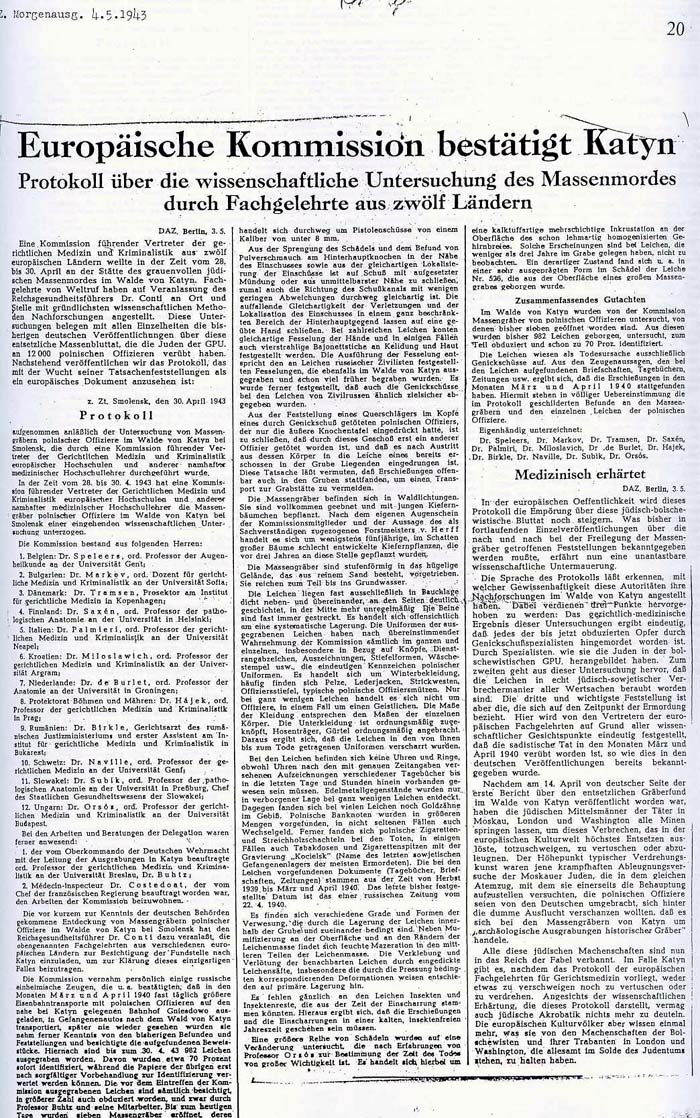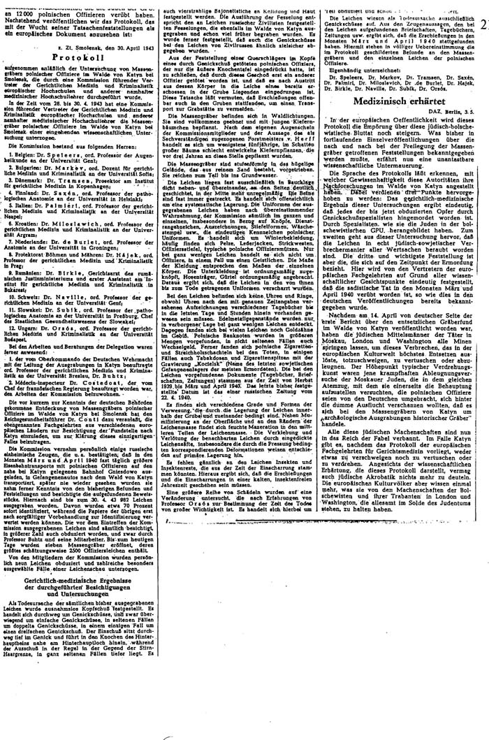 Raport przedstawicielstwa szwedzkiego z Berlina z dnia 4 maja 1943 z wycinkiem (w języku niemieckim) z D.A.Z. (Deutscher Allgemeine Zeitung) Morgenausg. Z dnia 4 maja 1943 z protokołem "Międzynarodowej Komisji Katyńskiej" W skład tej powołanej przez Niemców Komisji wchodzili przedstawiciele: Belgii, Bułgarii, Chorwacji, Danii, Finlandii, Holandii, Protektoratu Czech i Moraw, Rumunii, Słowacji, Szwajcarii, Węgier i Włoch.