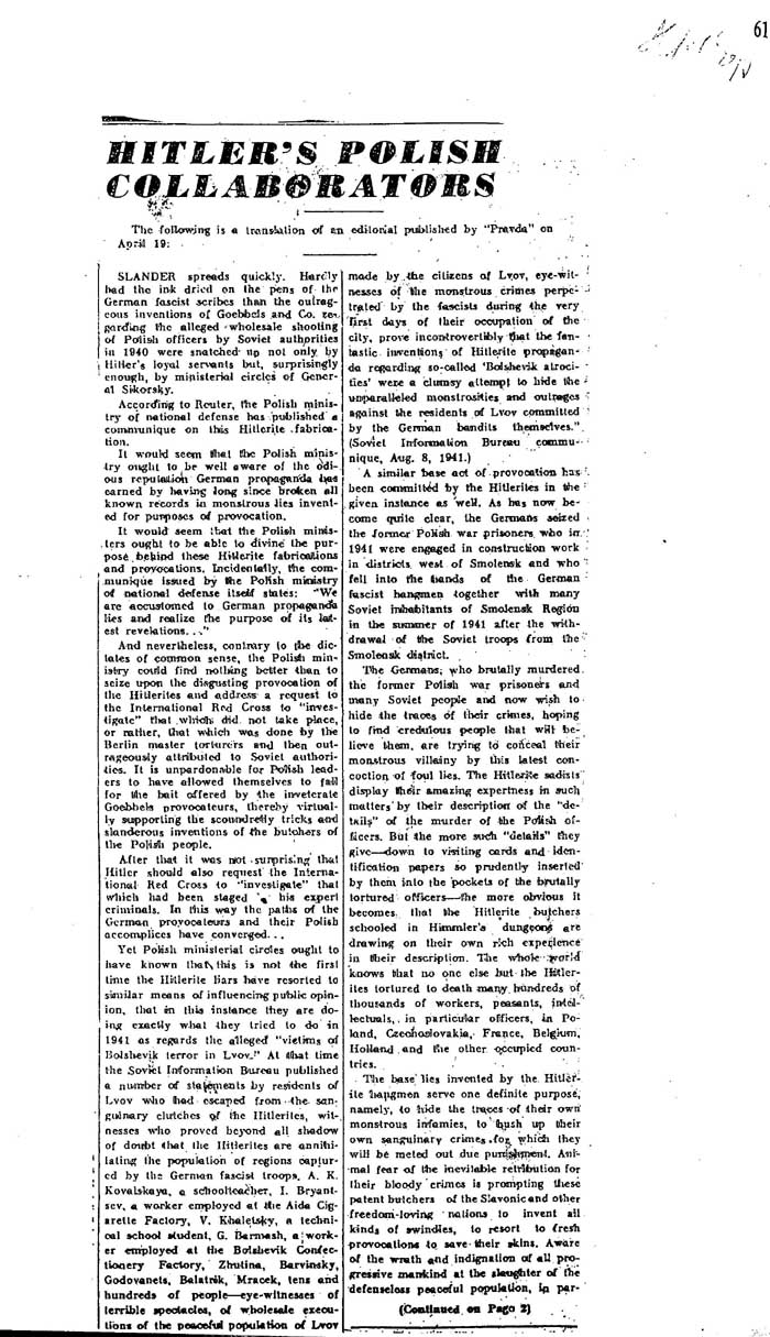 Tłumaczenie na angielski artykułu z "Prawdy" z dnia 19 kwietnia 1943 roku.