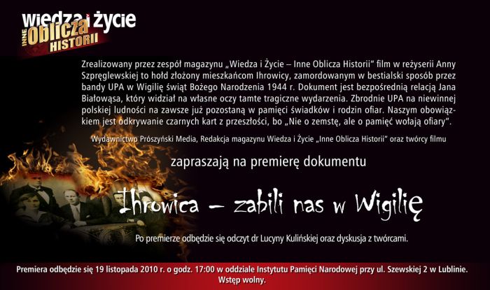 19 listopada br. w sali lubelskiego IPN (ul. Staszica 22A) odbyła się projekcja filmu dokumentalnego pt. „Zabili nas w Wigilię” o tragedii we wsi Ihrowica w 1944 roku. Projekcję poprzedziło wystąpienie dr Lucyny Kulińskiej.