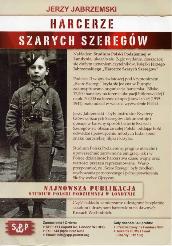 Drugie wydanie książki Jerzego Jabrzemskiego, pt. „Harcerze Szarych Szeregów”, ukazało się nakładem londyńskiego Studium Polski Podziemnej w bieżącym roku. Wydawca chciał w ten sposób uczcić pamięć poległego w katastrofie lotniczej pod Smoleńskiem, 10 kwietnia tego roku „ostatniego Prezydenta R.P. na Uchodźstwie, Druha Ryszarda Kaczorowskiego”, który „od wczesnych lat młodości z poświęceniem działał w ZHP podtrzymując czynnie zasady i wartości organizacji, zawsze świadom znaczenia prawdziwego patriotyzmu”. (…) Omawiana książka jest nieznacznie zmienioną i poprawioną wersją publikacji warszawskiego Wydawnictwa Naukowego PWN wydanej w stosunkowo niewielkim nakładzie w 1997 roku i bardzo szybko rozprzedanej. (…) Recenzowana książka jest pierwszym kompletnym opracowaniem historii męskiej organizacji Szarych Szeregów. Autorowi udało się nagromadzić ogromne bogactwo faktów, które najlepiej świadczą o olbrzymim dorobku organizacji na polu działań konspiracyjnych i wychowawczych. W książce opisano działalność Szarych Szeregów na terenie całej okupowanej RP (przy czym szczególnie wartościowa jest część poświęcona terenowi wschodniej Polski), ale skupiono się na najważniejszych aspektach działalności Szarych Szeregów. Barwność opisów, przy braku zbędnych powtórzeń (dzięki udanemu zastosowaniu schematu układu terytorialnego) sprawia, że czytelnik do końca w napięciu śledzi treść książki.