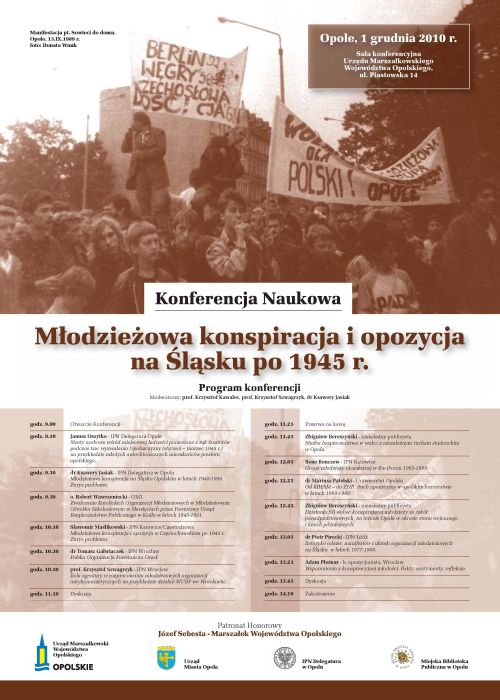 Instytut Pamięci Narodowej Oddział we Wrocławiu – Delegatura w Opolu oraz Miejska Biblioteka Publiczna w Opolu, Urząd Miasta Opola i opolski Urząd Marszałkowski zorganizowały konferencję naukową pt. „Młodzieżowa konspiracja i opozycja na Śląsku po 1945 roku”, która odbyła się w Opolu 1 grudnia 2010 r.