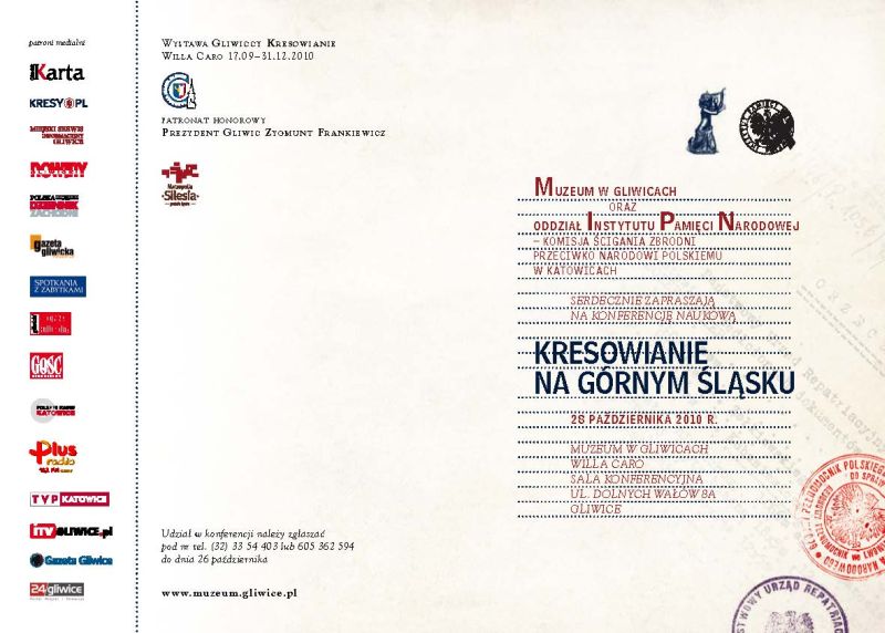 Muzeum w Gliwicach oraz Oddział Instytutu Pamięci Narodowej w Katowicach przygotowały konferencję naukową „Kresowianie na Górnym Śląsku”, która odbyła się 28 października 2010 r. w sali konferencyjnej Willi Caro w Gliwicach, przy ul. Dolnych Wałów 8 a.