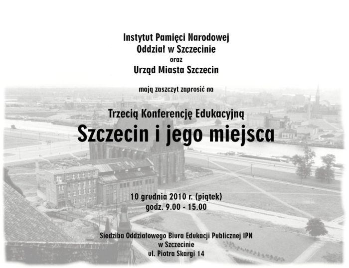 Instytut Pamięci Narodowej Oddział w Szczecinie oraz Urząd Miasta Szczecin zorganizowały III Konferencję Edukacyjną „Szczecin i jego miejsca”. Konferencja odbyła się w siedzibie Oddziałowego Biura Edukacji Publicznej IPN w Szczecinie, ul. Piotra Skargi 14.