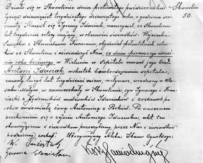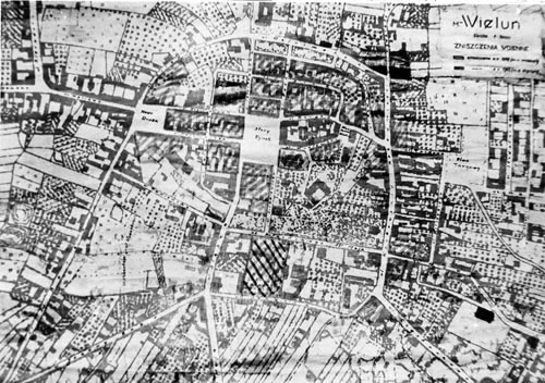 Plan miasta Wielunia ilustrujący zniszczenia wojenne miasta we wrześniu 1939 roku uwzględniający położenie Szpitala Wszystkich Świętych Fotokopia aktu zgonu zamordowanego w szpitalu w dniu 1 września 1939 r.