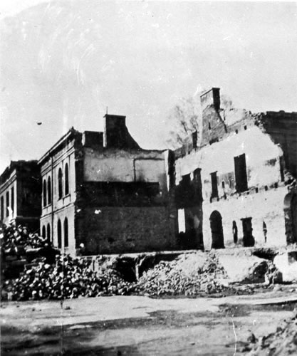 Ruiny Szpitala Wszystkich Świętych w Wieluniu po zbombardowaniu go przez lotnictwo hitlerowskie w dniu 1 września 1939 - widok od strony ul. obecnie 1-maja Cecylia Sobańska, zamordowana w dniu 1 września 1939 r. w Wieluniu przez lotników hitlerowskich