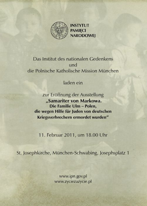 11 lutego w monachijskim kościele Świętego Józefa odbył się, z udziałem p.o. Prezesa Instytutu Pamięci Narodowej dra Franciszka Gryciuka, wernisaż wystawy „Samarytanie z Markowej. Ulmowie – Polacy zamordowani przez Niemców za pomoc Żydom”. Wystawa została przygotowana przez Instytut Pamięci Narodowej, Centralną Bibliotekę Rolniczą, Narodowe Centrum Kultury i Muzeum Historii Polskiego Ruchu Ludowego. Można ją zwiedzać w dniach 11–13 lutego 2011 r.