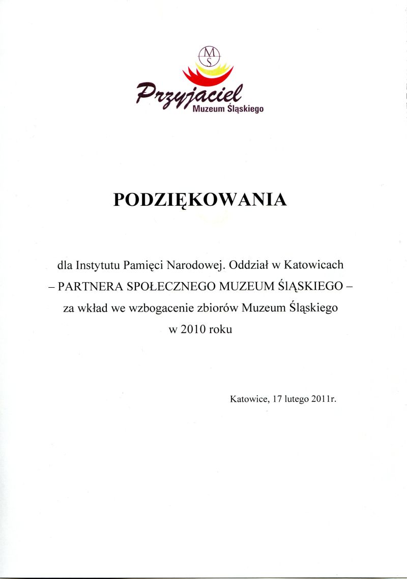W dniu 17 lutego 2011 r. w Muzeum Śląskim w Katowicach odbyło się drugie spotkanie z cyklu Galeria Przyjaciół Muzeum Śląskiego. Głównym założeniem jest wyróżnienie i nagrodzenie osób i instytucji, których wsparcie pozwoliło na zrealizowanie ciekawych i wartościowych projektów i wystaw, a tym samym przyczyniło się do rozpowszechniania dziedzictwa kulturowego Śląska. Oddział Instytutu Pamięci Narodowej w Katowicach otrzymał tytuł „Partnera Społecznego Muzeum Śląskiego 2010”.